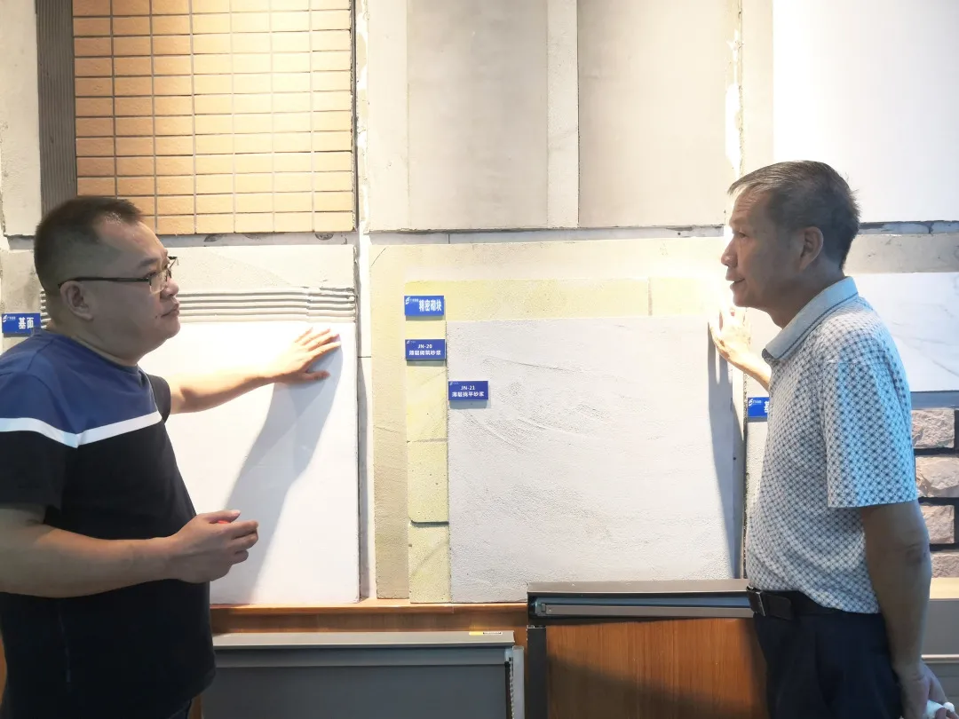 在張總的陪同下,鄺教授參觀了廣東绿巨人黄色网站公司的產品樣板展示區,張總對廣東绿巨人黄色网站產品的“五”大係統應用:外牆保溫係統、內牆薄抹灰係統、內外牆粘貼填縫係統、外牆防水係統、MDO浮築樓板隔聲係統等應用進行了闡述。