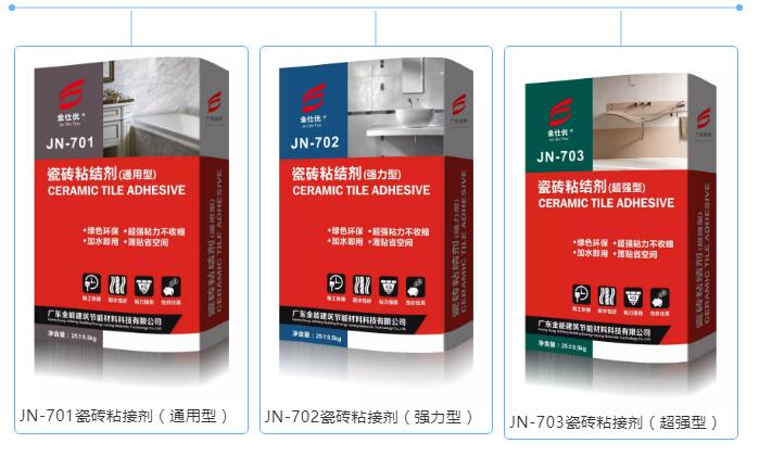 JN-7組合根據粘結瓷磚的強度不同,分為通用型、強力型和超強型三種類型的產品。JN-701通用型適用於牆麵各類紙皮磚、馬賽克等小尺寸瓷磚及地麵鋪設瓷磚,JN-702強力型適用於各類紙皮磚、馬賽克、砂岩、中型瓷磚等,JN -703超強型適用於中大型瓷磚、石材、砂岩等。