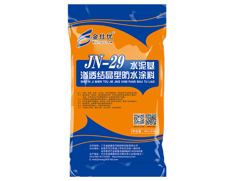 JN-29水泥基滲透結晶型成人绿巨人导航网站是一種分子結構為活性矽的活性物質,分子量小,同時含有疏水基團和親水基團,其親水性大於疏水性,可溶於水,在幹燥環境中不發生縮聚結晶現象,而在潮濕環境中發生縮聚結晶現象。由活性矽、水泥、活性無機混合物等混合而成。
